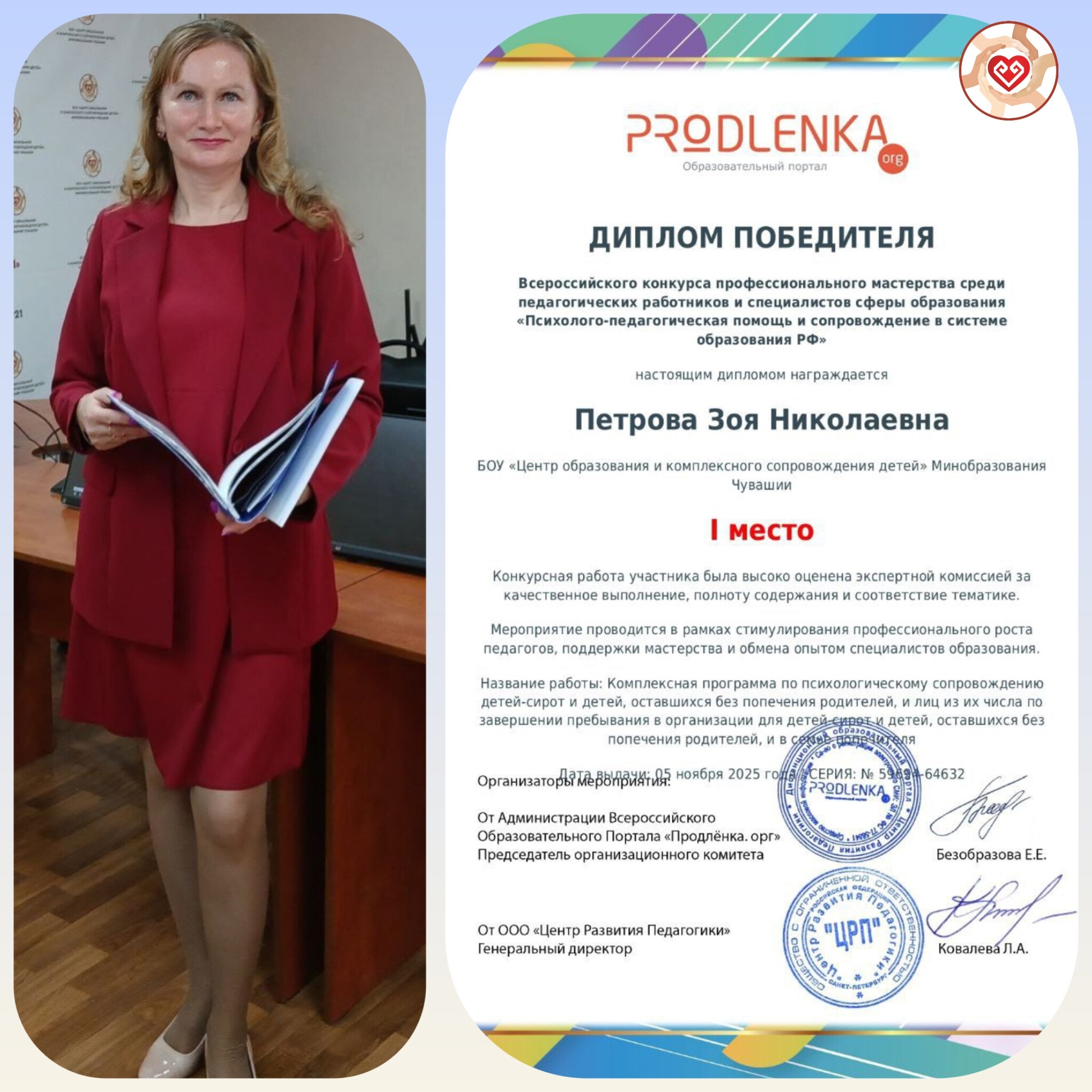 5 ноября 2025 года Зоя Петрова, педагог-психолог БОУ «ЦО и КСД» Минобразования Чувашии приняла участие во Всероссийском конкурсе профессионального мастерства среди педагогических работников и специалистов сферы образования. На конкурс была представлена авторская "Комплексная программа по психологическому сопровождению детей-сирот и детей, оставшихся без попечения родителей, и лиц из их числа по завершении пребывания в организации для детей-сирот и детей, оставшихся без попечения родителей, и в семье попечителя". Публикация успешно прошла экспертную оценку. Авторский материал прошел редакционный отбор, проверку системой Antiplagiat. Результат - 1 место в номинации "Психолого-педагогическая помощь и сопровождение в системе образования РФ& ... Читать дальше » |