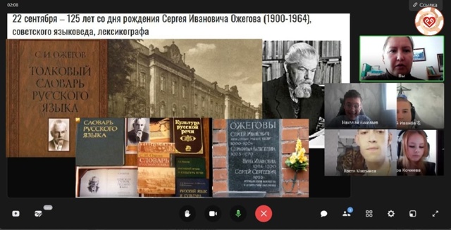 Для обучающихся 5–11 классов Республиканского центра дистанционного образования БОУ «Центр образования и комплексного сопровождения детей» Минобразования Чувашии 22 сентября 2025 года под руководством учителя русского языка и литературы Евдокимовой Надежды Николаевны прошли мероприятия, посвящённые 125-летию со дня рождения Сергея Ивановича Ожегова, автора знаменитого «Толкового словаря». В ходе познавательной встречи «Двигатель» словарного дела — Сергей Иванович Ожегов» ребята 5–7 классов познакомились с жизнью и творчеством С. И. Ожегова, его вкладом в развитие языка, а также поговорили о значении его словарей. У