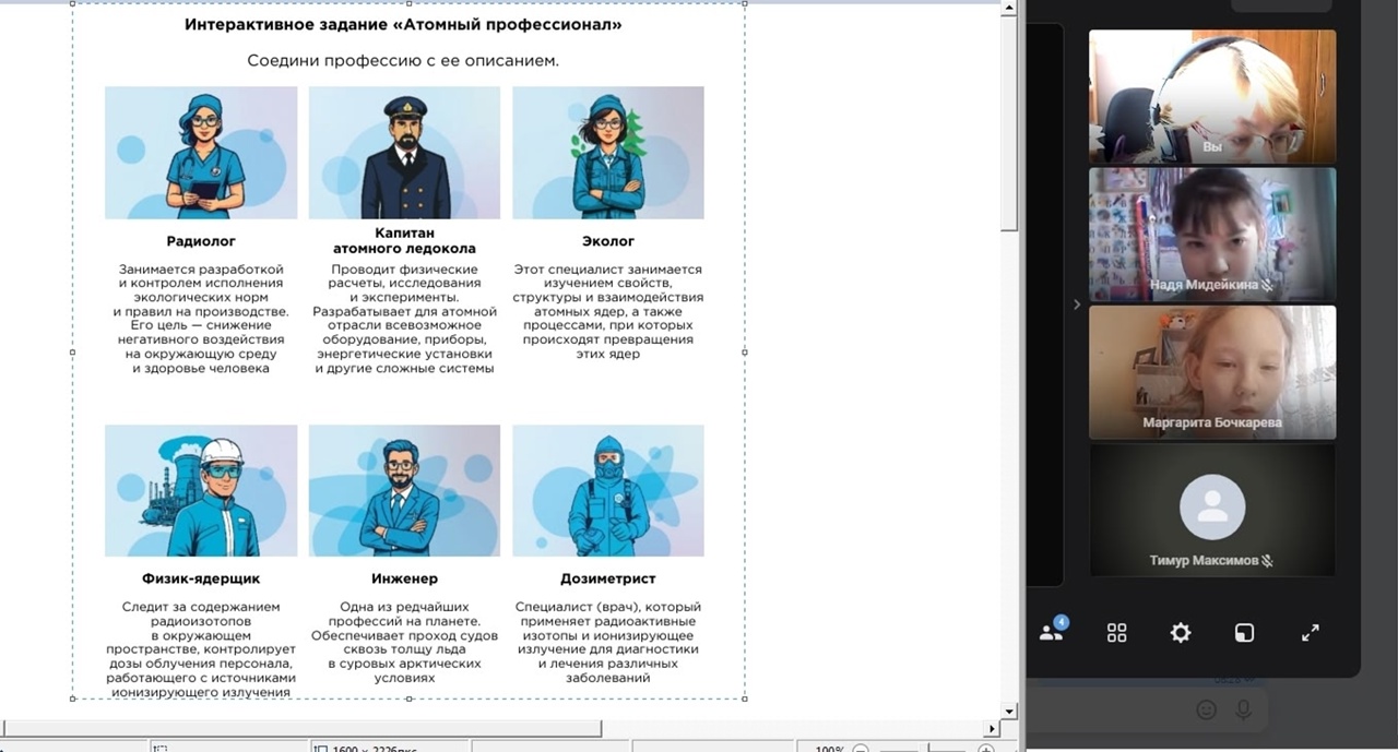 Классный час стал поводом вспомнить, что мирный атом играет ключевую роль в обеспечении человечества чистой энергией, развитии неядерных технологий и улучшении качества жизни миллионов людей. В ходе выполнения интерактивного задания «Атомный профессионал» учащиеся сопоставляли с описанием такие «атомные» профессии, как радиолог, капитан атомного ледокола, эколог, физик-ядерщик, инженер, дозиметрист. Ребята узнали, чт