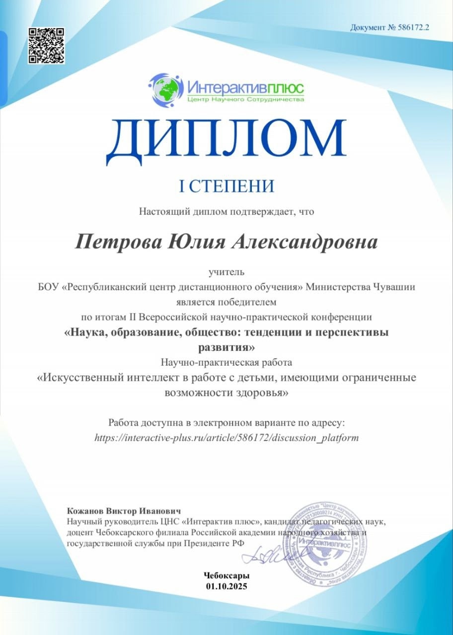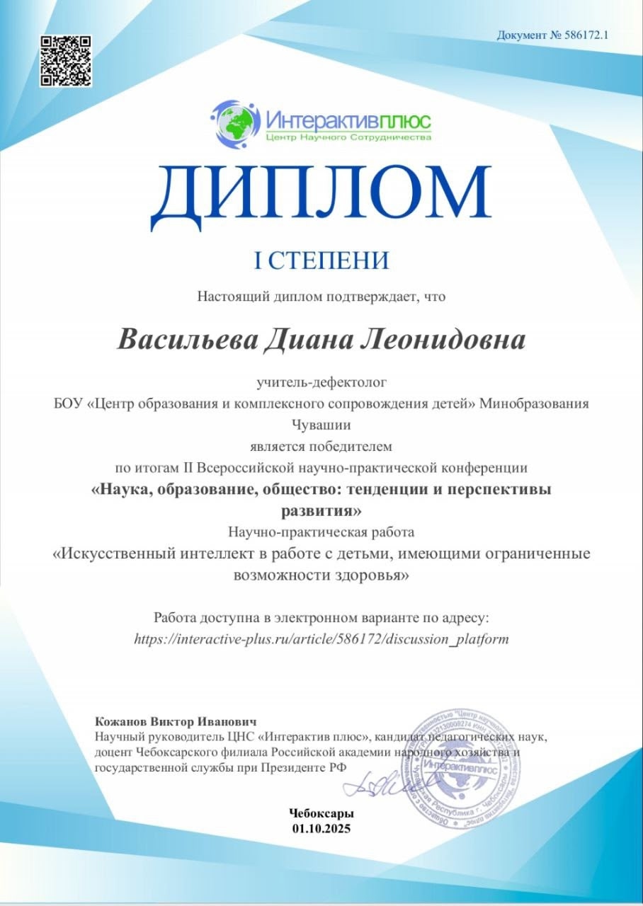 С гордостью сообщаем, что учитель Петрова Ю.А. и дефектолог Васильева Д.Л. БОУ " Центр образования и комплексного сопровождения детей" Минобразования Чувашии, стали победителями первой степени на II Всероссийской научно-практической конференции "Наука, образование, общество: тенденции и перспективы развития"! Их научно-практическая работа "Искусственный интеллект в работе с детьми, имеющими ограниченные возможности здоровья" получила высокую оценку и признание коллег.