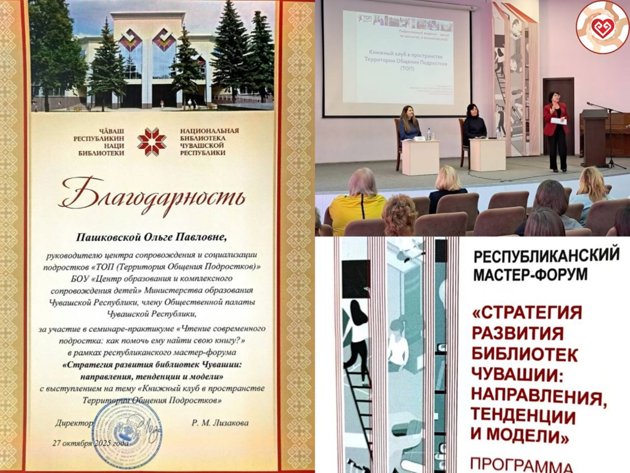 Руководитель центра сопровождения и социализации подростков «ТОП (Территория Общения Подростков)» Центра образования и комплексного сопровождения детей Минобразования Чувашии Ольга Пашковская приняла участие в работе семинара-практикума «Чтение современного подростка: как помочь ему найти свою книгу». Семинар стал одной из площадок в рамках республиканского мастер-форума «Стратегия развития библиотек Чувашии: направления, тенденции и модели».