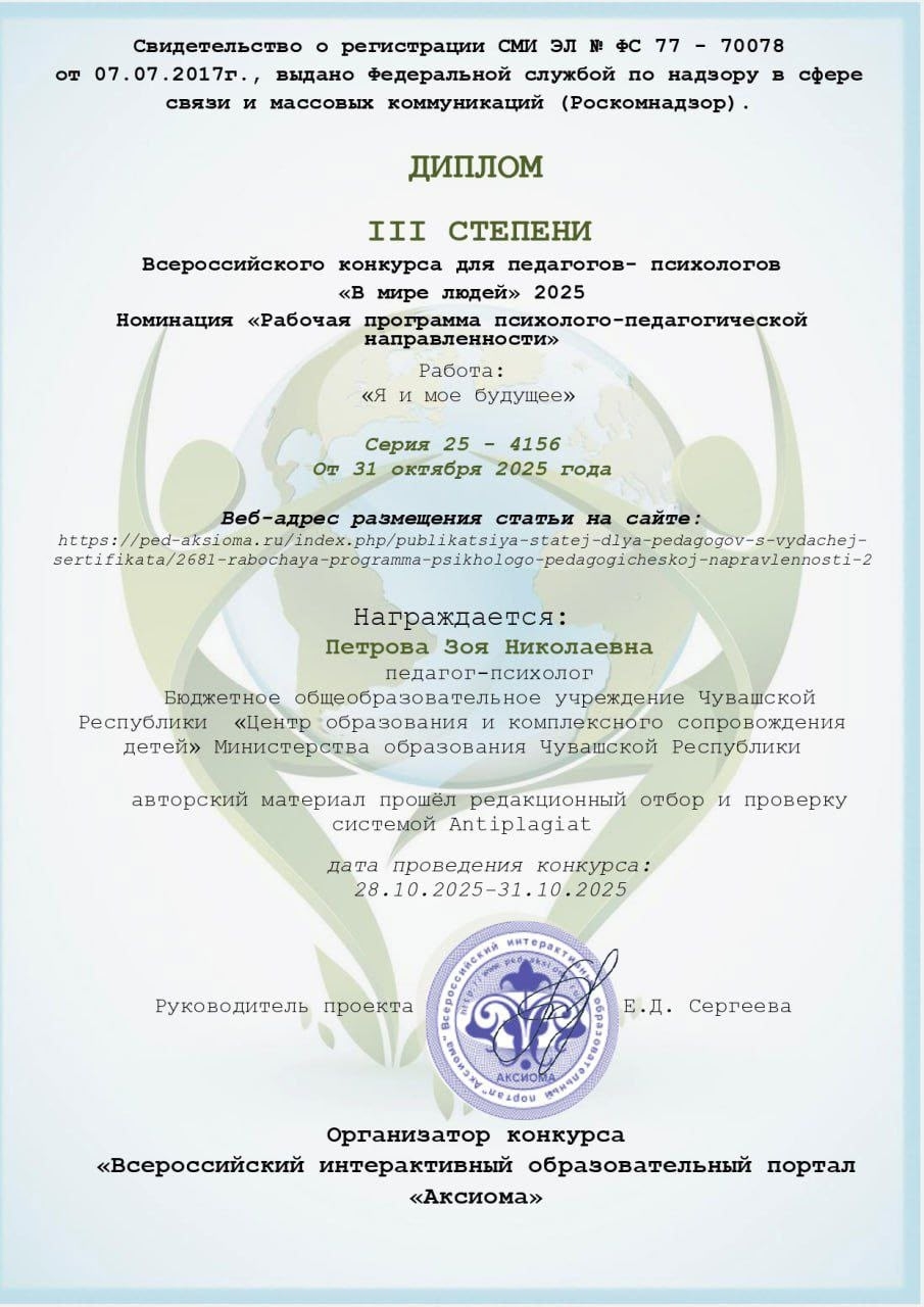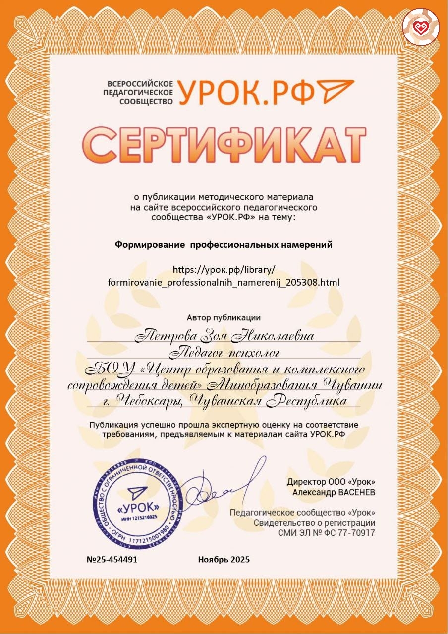 1 ноября 2025 года Зоя Петрова, педагог-психолог БОУ «ЦО и КСД» Минобразования Чувашии опубликовала статью на тему "Формирование профессиональных намерений" и получила сертификат о публикации методического материала на сайте всероссийского педагогического сообщества "Урок.РФ". Публикация успешно прошла экспертную оценку. Авторский материал прошел редакционный отбор, проверку системой Antiplagiat.