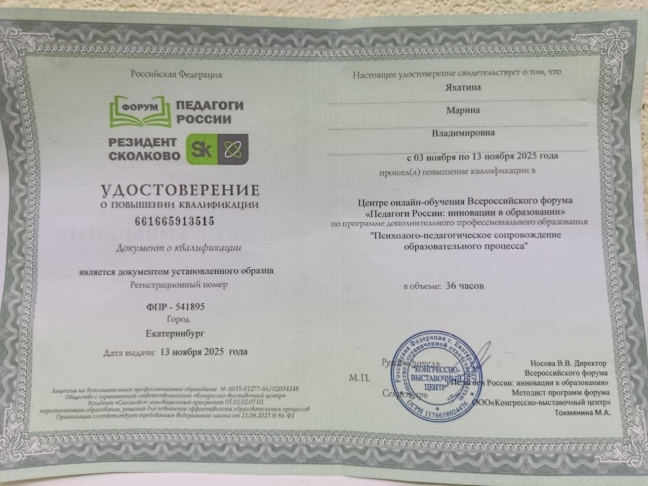 Яхатина Марина Владимировна, педагог-психолог БОУ "Центр образования и комплексного сопровождения детей" Минобразования Чувашии, специалист сопровождения замещающих семей по Ленинскому району г. Чебоксары с 03 ноября по 13 ноября 2025 г. проходила онлайн-обучение по программе дополнительного профессионального образования «Психолого-педагогическое сопровождение образовательного процесса» в Центре онлайн-обучения Всероссийского форума «Педагоги России: инновации в образовании», на основании данного онлайн-обучения было получено Удостоверение о повышении квалификации. Важность повышения квалификации педагога-психолога позволяет специалисту быть в курсе современных подходов, расширять профессиональный кругозор, а также помогает личностному развитию, что снижает риск эмоционального выгорания в профессиональной среде. Повышение квалификации педагога-психолога важно по нескольким причинам: -Обновление знаний. Специалист получает новые сведения в области психологии и педагогики, осваивает современные методы диагностики, коррекции и консультирования. -Адаптация к изменениям. Педагог-психолог учится приспосабливаться к изменяющимся образовательным стандартам и законодательным требованиям. -Совершенствование навыков. Специалист улучшает коммуникативные и аналитические навыки, что важно для эффективной работы. | |