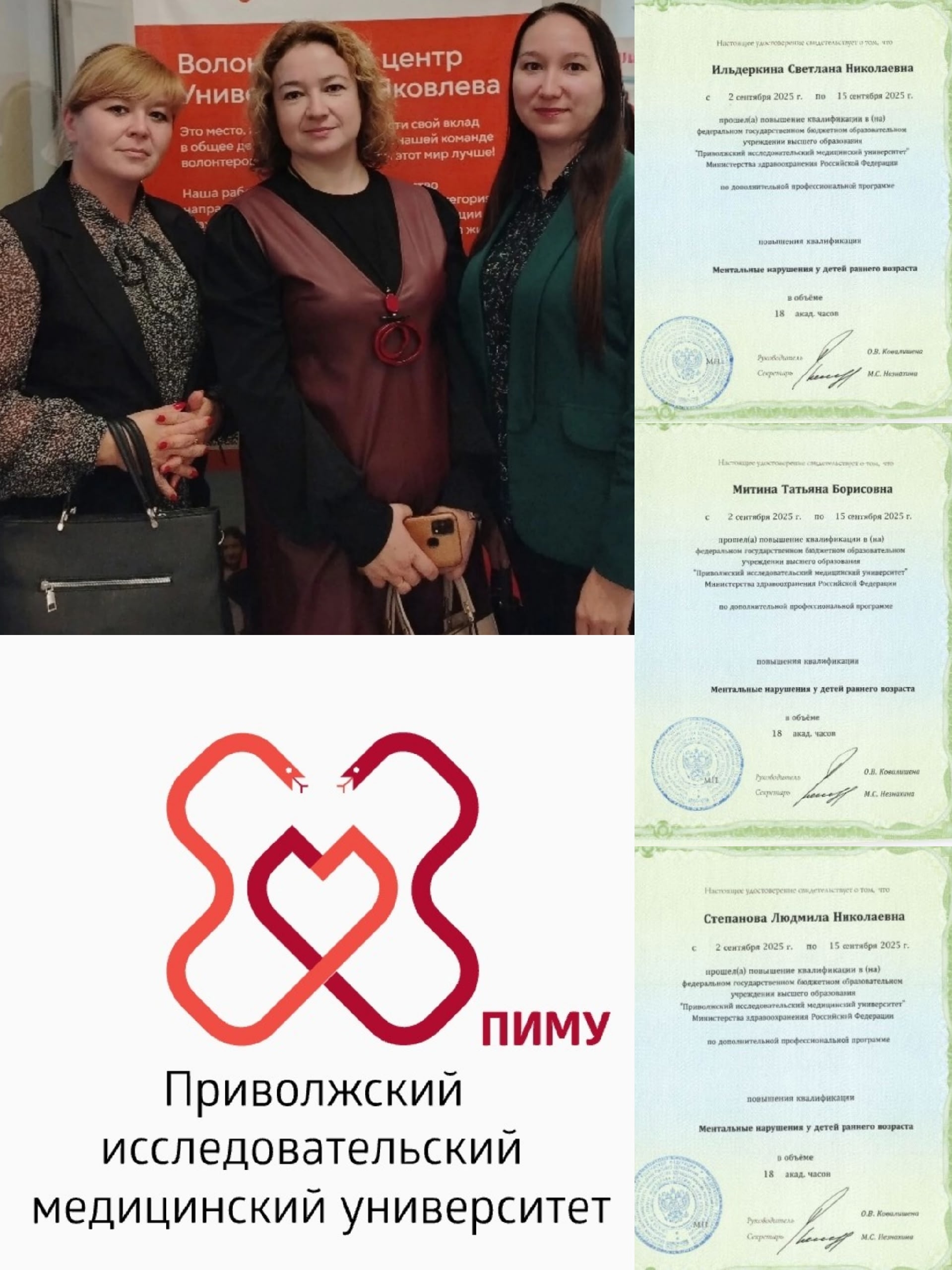В начале сентября 2025 года заместитель руководителя Центральной ЦПМПК Чувашской Республики Светлана Ильдеркина и специалисты комиссии Татьяна Митина и Людмила Степанова успешно завершили обучение по дополнительной профессиональной программе повышения квалификации «Ментальные нарушения у детей раннего возраста». Обучение проводилось Приволжским исследовательским медицинским университетом в рамках общественного проекта ПФО «Ментальное здоровье». Программа обучения охватывала широкий спектр вопросов, связанных с особенностями психического развития детей раннего возраста, диагностикой нарушений развития, особенностями взаимодействия с детьми с расстройствами аутистического спектра (РАС) и другими нарушениями, маршрутизацией ребенка с РАС в системе комплексной помощи, а также рекомендациями по общению с родителями. Полученные знания помогут специалистам еще эффективнее выявлять и оказывать своевременную помощь детям с ментальными нарушениями. Обучение завершилось успешной аттестацией, по итогам которой специалисты получили удостоверения установленного образца. | |