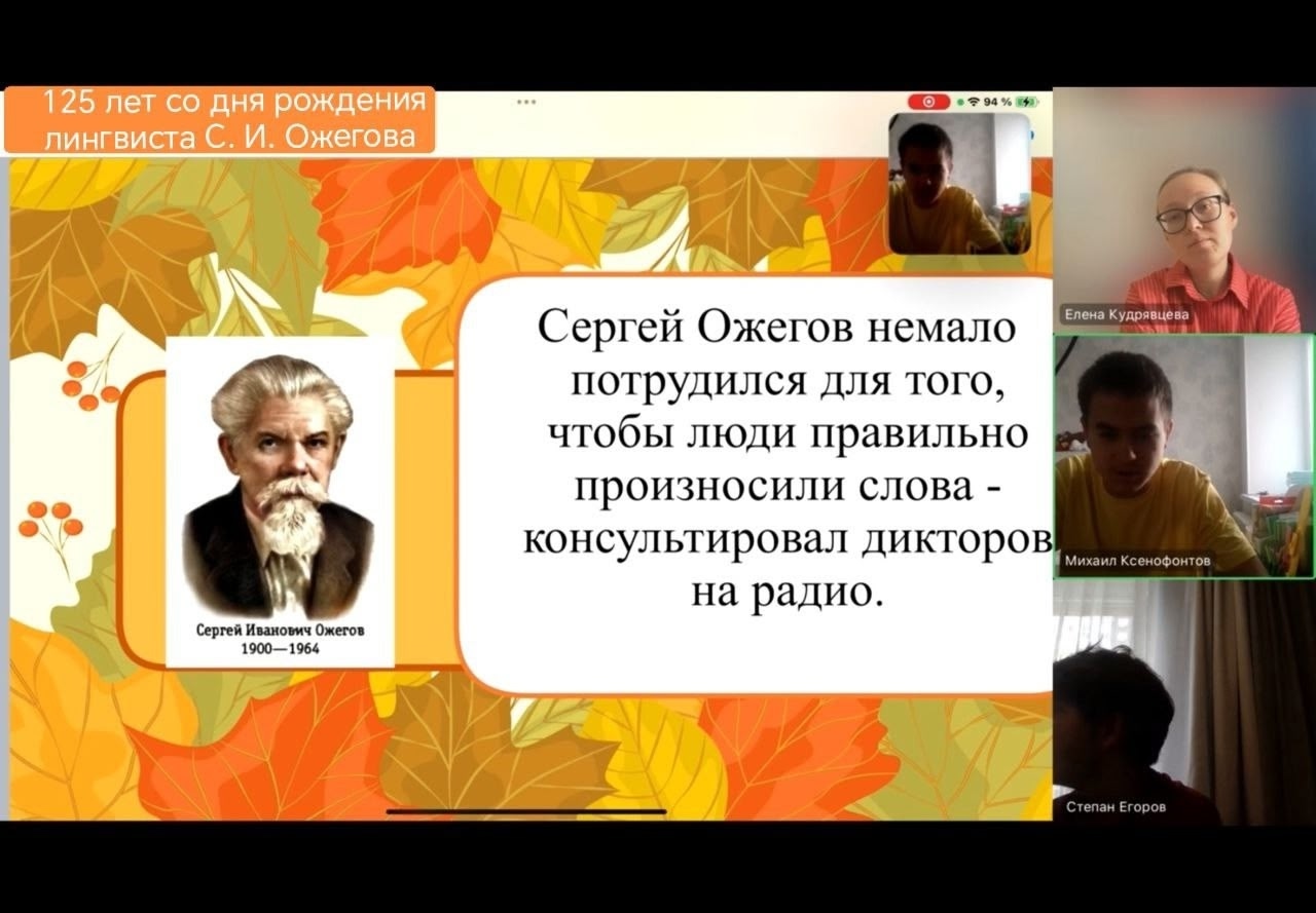 В рамках празднования 125-летия со дня рождения выдающегося русского лингвиста С. И. Ожегова проводится Всероссийское тестирование. Обучающиеся БОУ «Центр образования и комплексного сопровождения детей» Минобразования Чувашии под руководством учителя русского языка Е. Кудрявцевой начали активно участвовать во Всероссийском тестировании «Культура речи». Тестирование позволит не только выявить сильные и слабые стороны в знании норм русского языка, но и получить ориентиры для дальнейшего самообразования. Также в 8-х классах повторили тему «Лексика», в 9-х классах вспомнили орфоэпические нормы, а ученики 11-х классов углубили свои знания, познакомившись с жизнью и деятельностью С. И. Ожегова. «Толковый словарь русского языка» этого выдающегося лингвиста — настоящая энциклопедия языка, позволяющая понять семантику слов и нюансы их употребления. | |