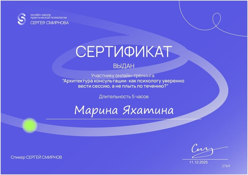 Педагог-психолог БОУ "Центр образования и комплексного сопровождения детей" Минобразования Чувашии Марина Яхатина в декабре 2025 года прошла краткосрочный онлайн-тренинг «Архитектура консультации: как психологу уверенно вести сессию, а не плыть по течению».