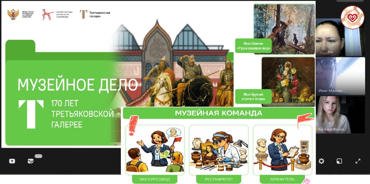 На уроке учителя рассказали о Российских музеях — хранителях богатейшего материального и нематериального наследия страны, совершили виртуальное путешествие по Государственной Третьяковской галерее, рассказали о труде работников музея, благодаря которым сохраняется исторический опыт жизни, впечатления и эмоции прошлых поколений. Педагоги подчеркнули значимость роли защитников Отечества в сохранении