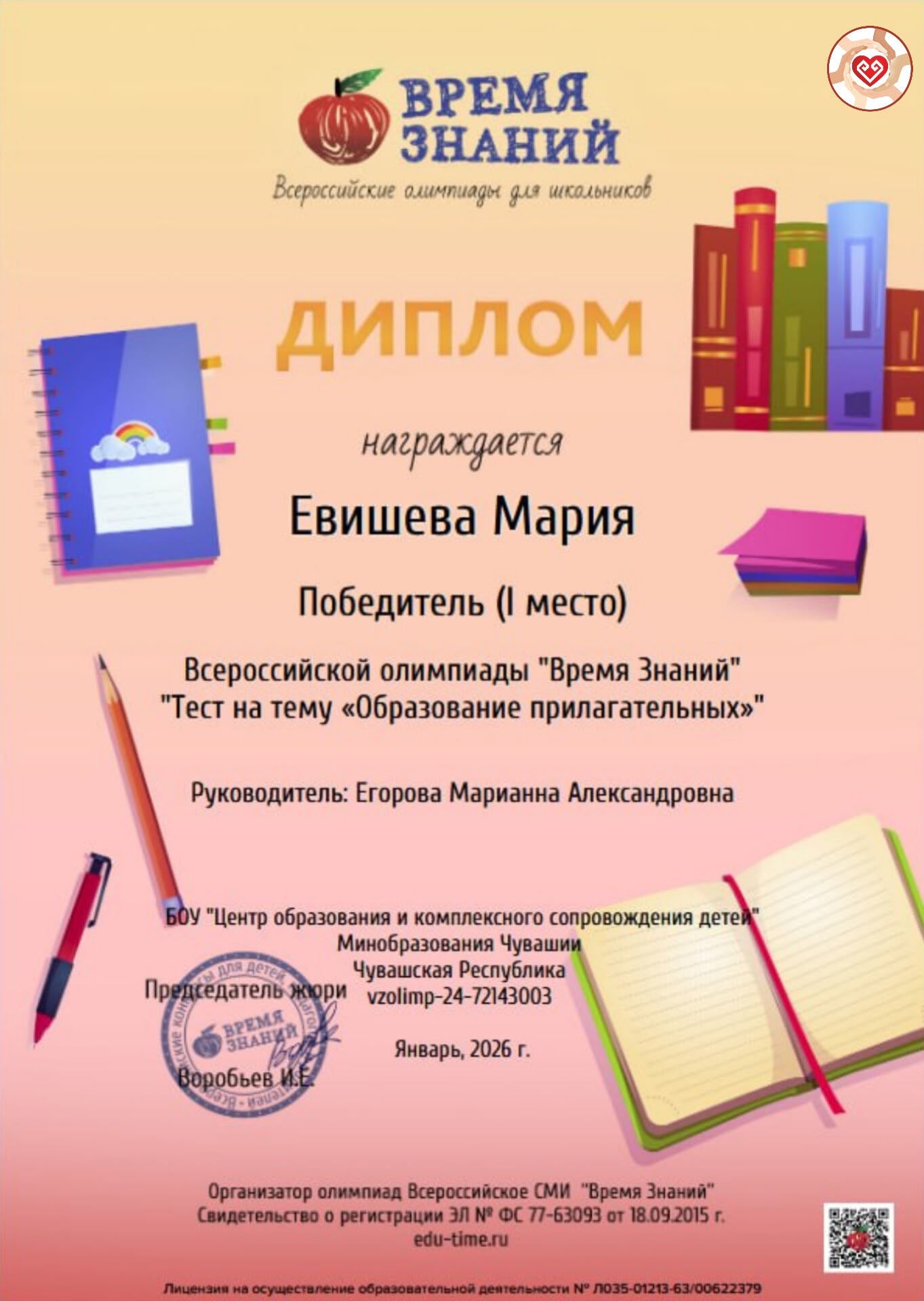 29 января 2026 года ученица центра дистанционного образования Евишева Мария (6 а) под руководством учителя Егоровой Марианны приняла участие во Всероссийской олимпиаде по русскому языку «Время знаний» «Образование имен прилагательных», организованной образовательной Всероссийской организацией СМИ «Время знаний» г. Тольятти.