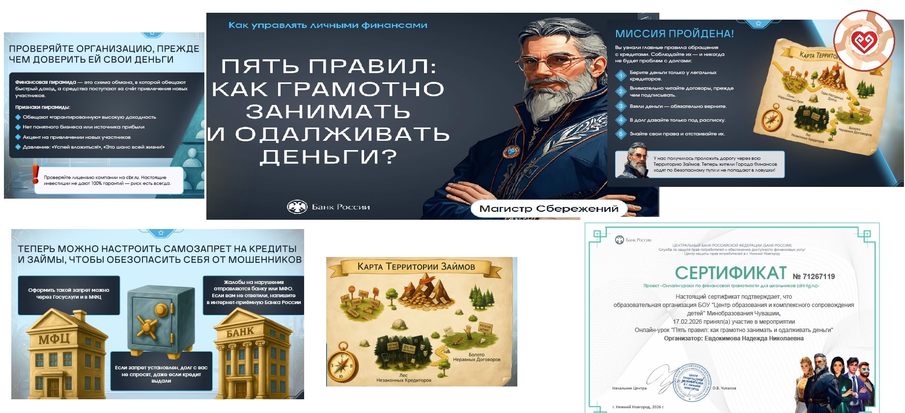 Обучающиеся 10А и 10Б классов Республиканского центра дистанционного образования БОУ «Центр образования и комплексного сопровождения детей» Минобразования Чувашии 17 февраля 2026 года под руководством учителя Евдокимовой Надежды Николаевны приняли участие в онлайн-занятии по финансовой грамотности «Пять правил: как грамотно занимать и одалживать деньги».