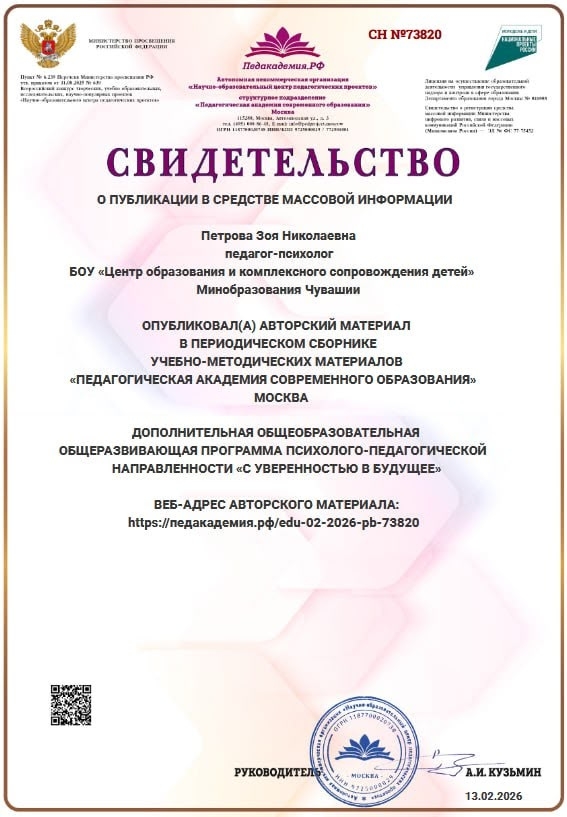 13 февраля 2026 года Зоя Петрова, педагог-психолог БОУ «ЦО и КСД» Минобразования Чувашии получила свидетельство, опубликовав авторский материал в периодическом сборнике учебно-методических материалов «Педагогическая академия современного образования» Москва в рамках реализации национального проекта «Молодёжь и дети» и в рамках реализации государственной программы Российской Федерации «Развитие образования» АНО «Научно-Образовательный Центр Педагогических Проектов» город Москва.