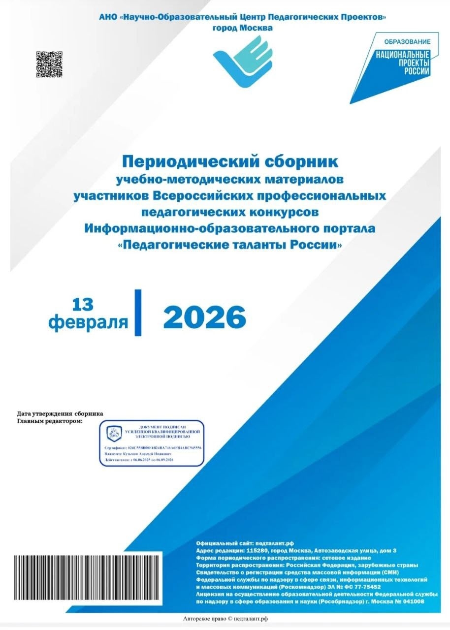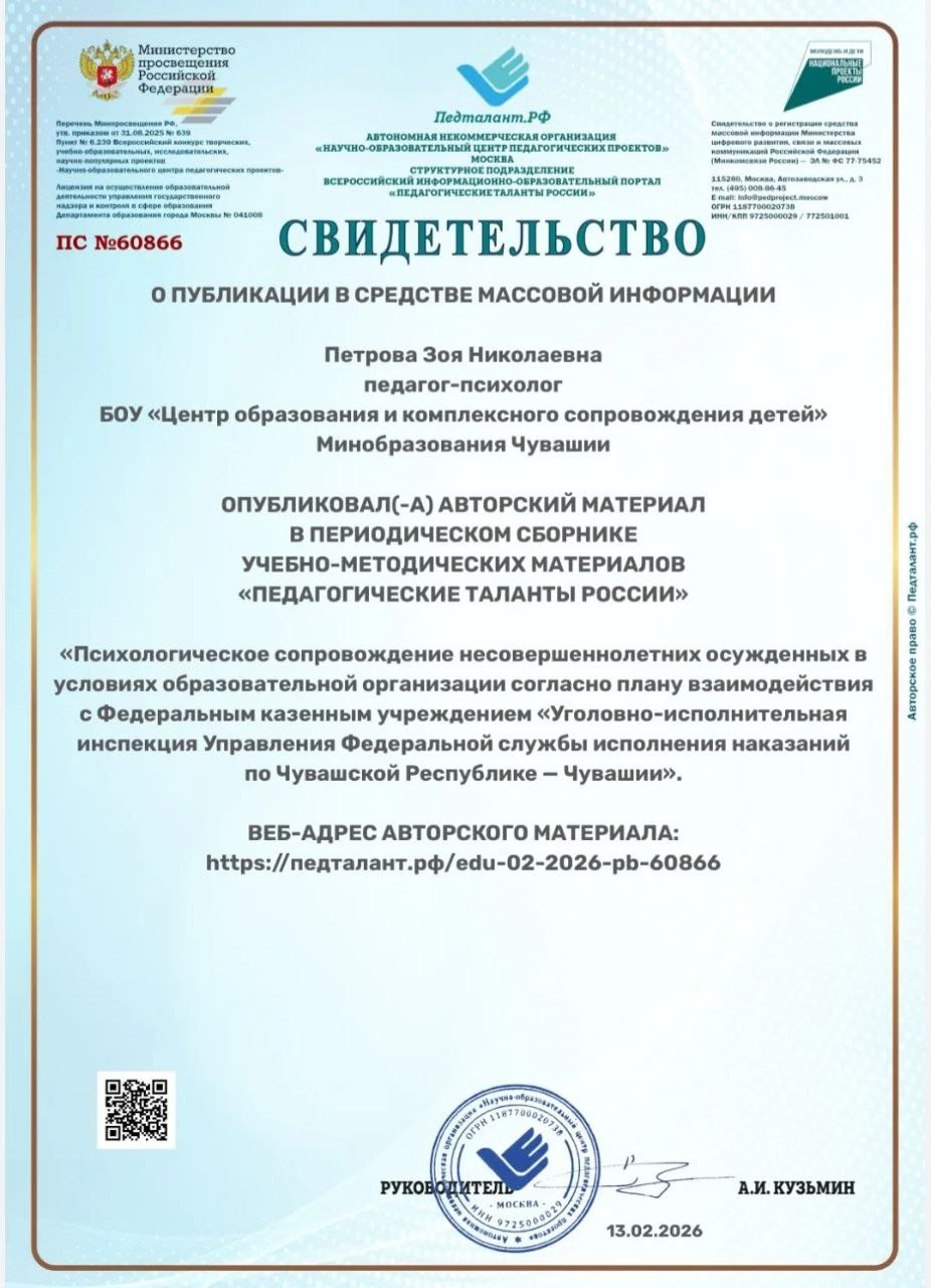 20 февраля 2026 года Зоя Петрова, педагог-психолог БОУ «ЦО и КСД» Минобразования Чувашии, получила благодарность и свидетельство, опубликовав статью в периодическом сборнике учебно-методических материалов участников Всероссийских конкурсов информационно-образовательного портала "Педагогические таланты России" в рамках реализации государственной программы Российской Федерации «Развитие образования» АНО «Научно-Образовательный Центр Педагогических Проектов», город Москва.