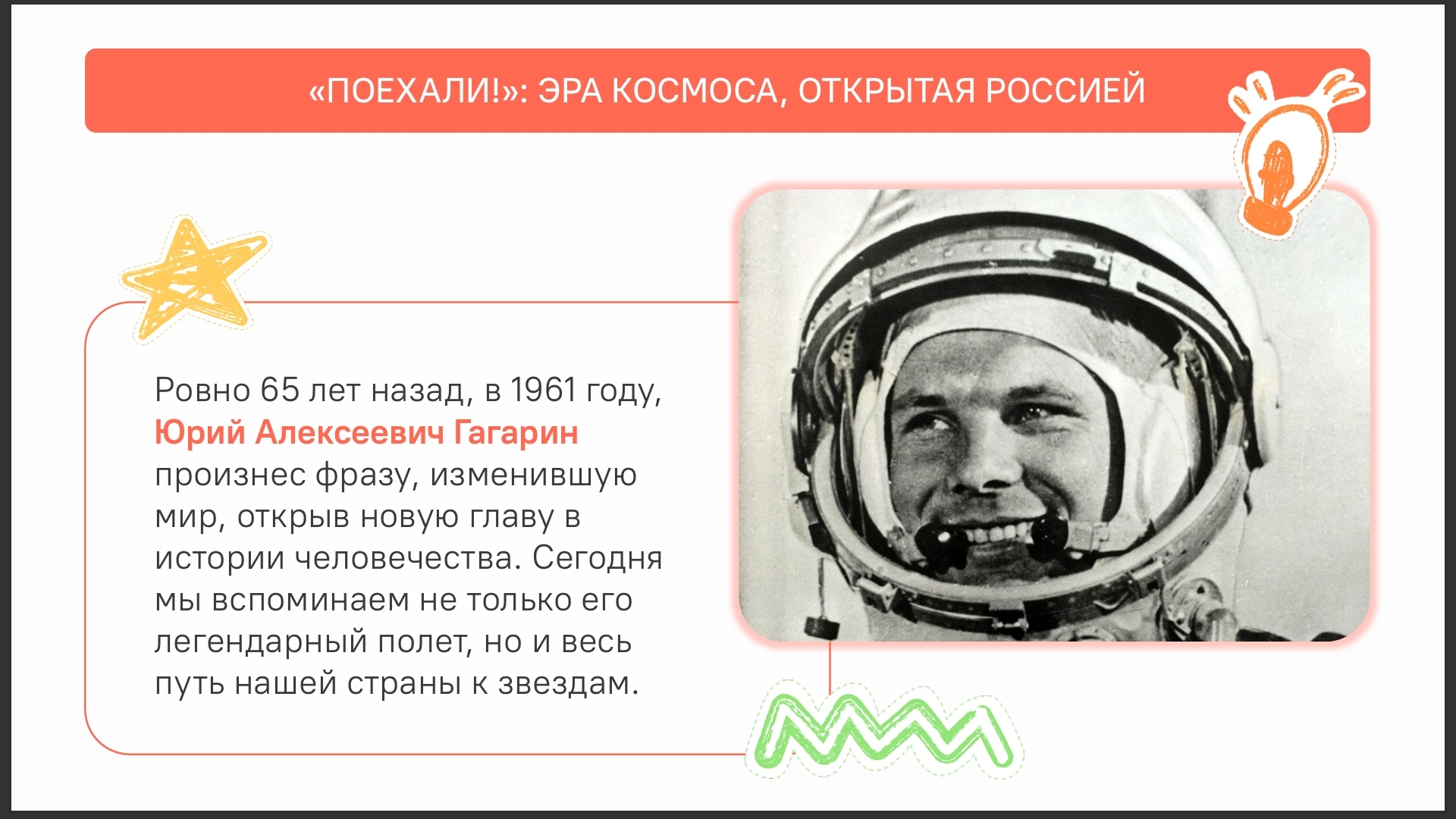 Мероприятие было нацелено на то, чтобы расширить кругозор учащихся и вдохновить их на изучение науки и техники. Ребята познакомились с ключевыми этапами развития отечественной космонавтики и убедились, что Россия — одна из ведущих космических держав. Ученики узнали, почему развитие космической отрасли &md