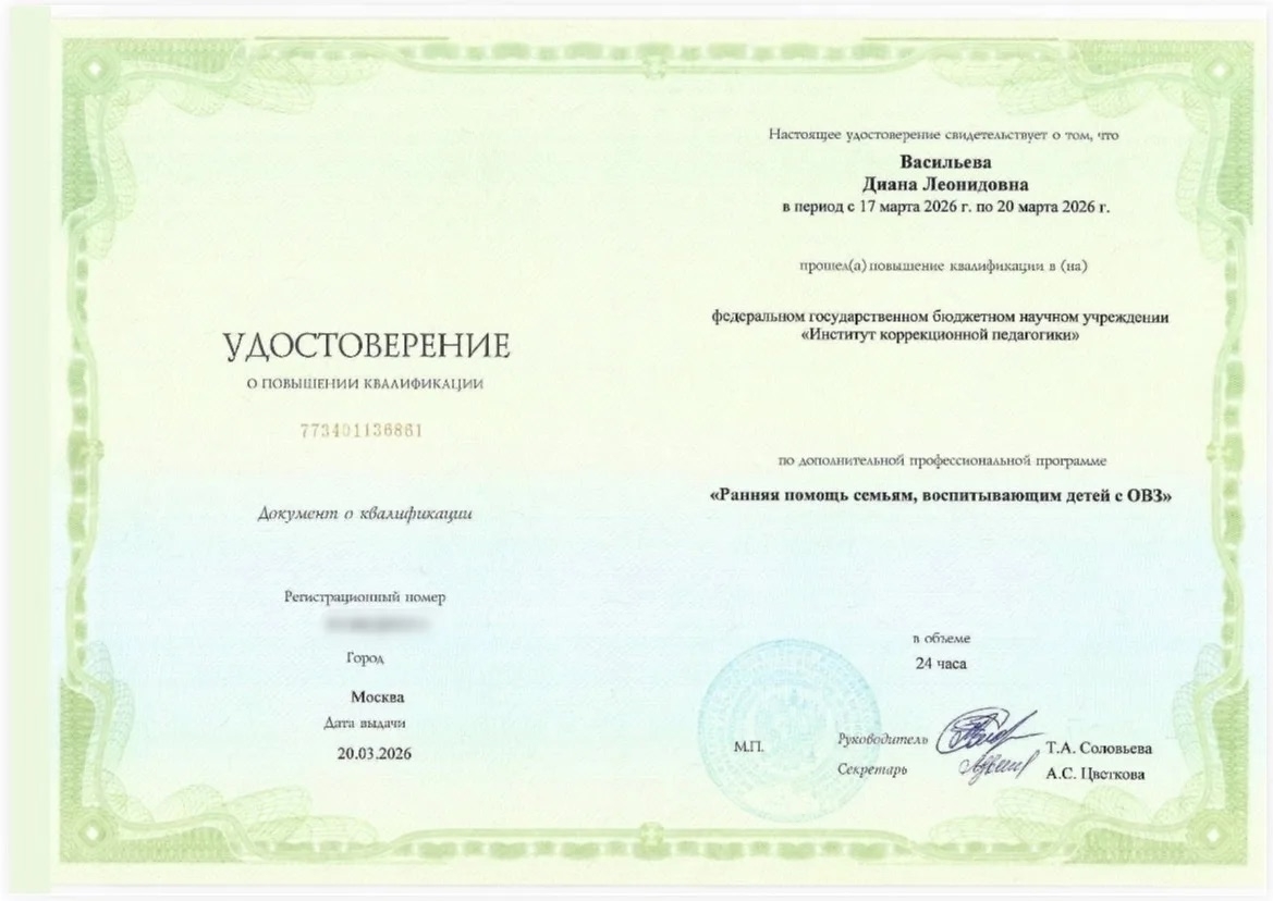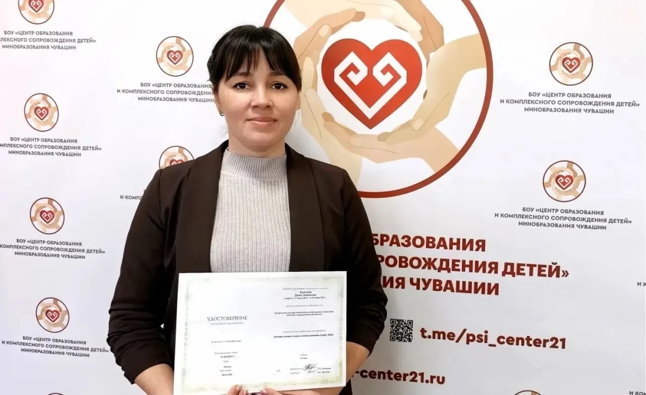 С 17 по 20 марта 2026 года учитель-дефектолог Центральной ПМПК БОУ «Центр образования и комплексного сопровождения детей» Минобразования Чувашии Диана Васильева прошла курс повышения квалификации «Ранняя помощь семьям, воспитывающим детей с ограниченными возможностями здоровья». Курс организован Федеральным государственным бюджетным научным учреждением «Институт коррекционной педагогики».