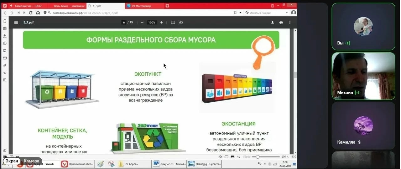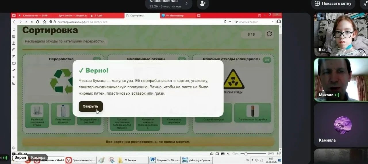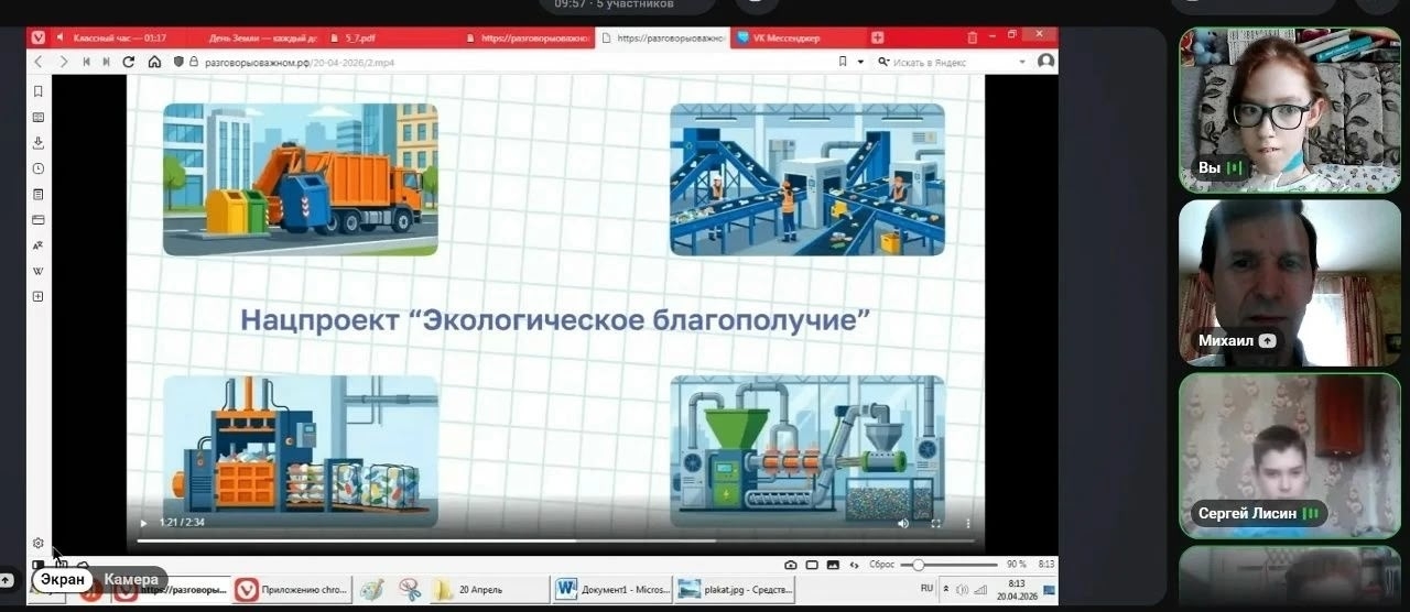В Республиканском центре дистанционного образования БОУ «Центр образования и комплексного сопровождения детей» Минобразования Чувашии 20 апреля 2026 года для обучающихся 1 – 11 классов прошли занятия «Разговоры о важном» на тему: «День Земли — каждый день». Занятия начались с просмотра видеоролика-анонса с Софией Петровой о состоянии планеты, о личной ответственности каждого человека, поскольку от экологических решений каждого из нас зависит здоровье людей, качество жизни и будущее всего человечества.