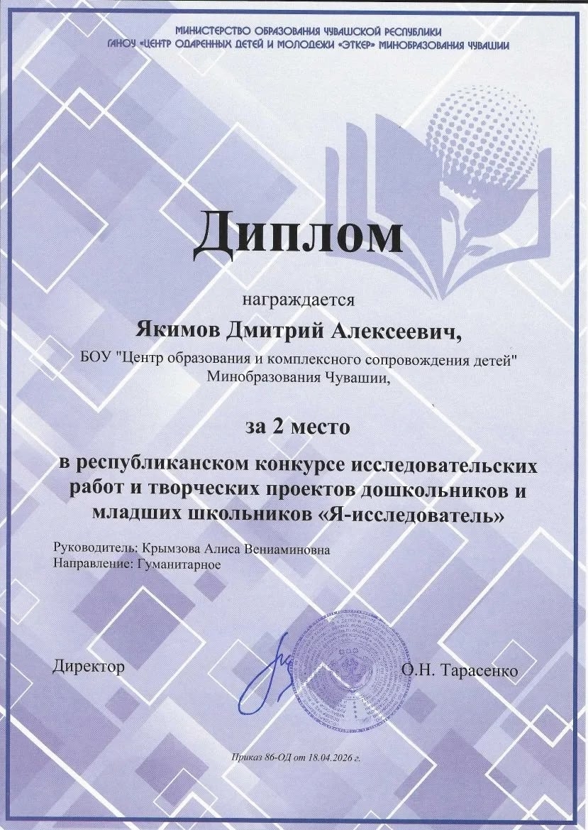 18 апреля 2026 года на площадке ГАНОУ «Центр одаренных детей и молодёжи «Эткер» Минобразования Чувашии состоялся очный этап Республиканского конкурса исследовательских работ и творческих проектов дошкольников и младших школьников «Я-исследователь». Экспертным комиссиям на проверку были предоставлены более 100 исследовательских работ дошкольников и младших школьников по 4 направлениям и 3 возрастным группам. По итогам проверки в очный тур приглашены свыше 50 участников, среди которых и обучающийся 4а класса Республиканского центра дистанционного образования Якимов Дмитрий. Дима успешно защитил свой проект и стал призёром!