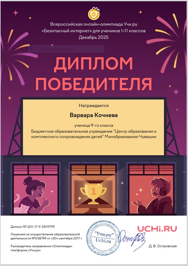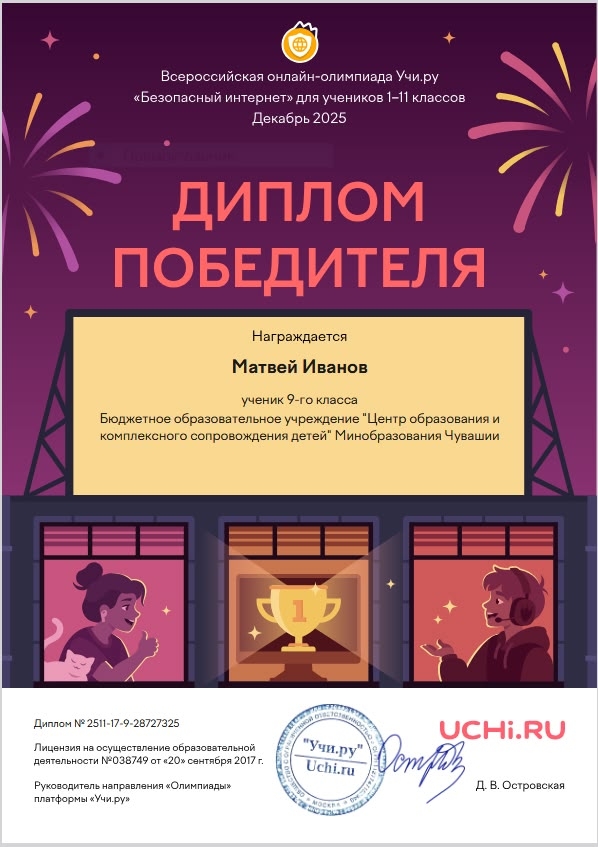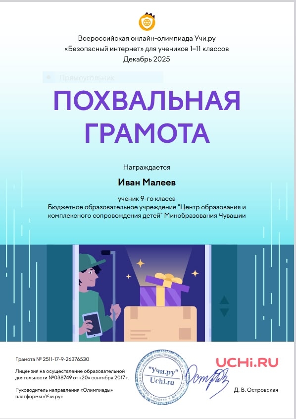 Подведены итоги Всероссийской олимпиады «Безопасный интернет» на образовательной платформе Учи.ру, которая завершилась 8 декабря 2025 года. Ученики центра дистанционного образования Кочнева Варвара, Иванов Матвей (9 а) и Малеев Иван (9 б) под руководством куратора Егоровой Марианны приняли участие и стали победителями. Данное мероприятие было полезно детям и родителям. Основная цель олимпиады — научить детей разумному и безопасному поведению в сети, объяснить основные правила использования электронных средств с выходом в интернет и развить навыки работы с информацией. Поздравляем учеников с победой и желаем дальнейших успехов! | |
